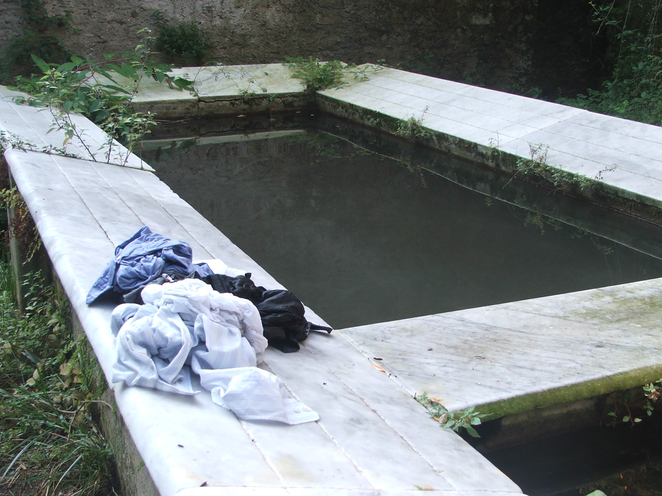 So, about 2005-6, a tree came down onto the laundry’s corrugated-iron roof. The Comune council, faced with the choice of repair or removal, chose removal; and since then the water and sunlight have started to do their work in accordance with the second law of thermodynamics. Primarily it is now the unchecked growth of weeds, pulling apart the stonework slowly, that is the concern.